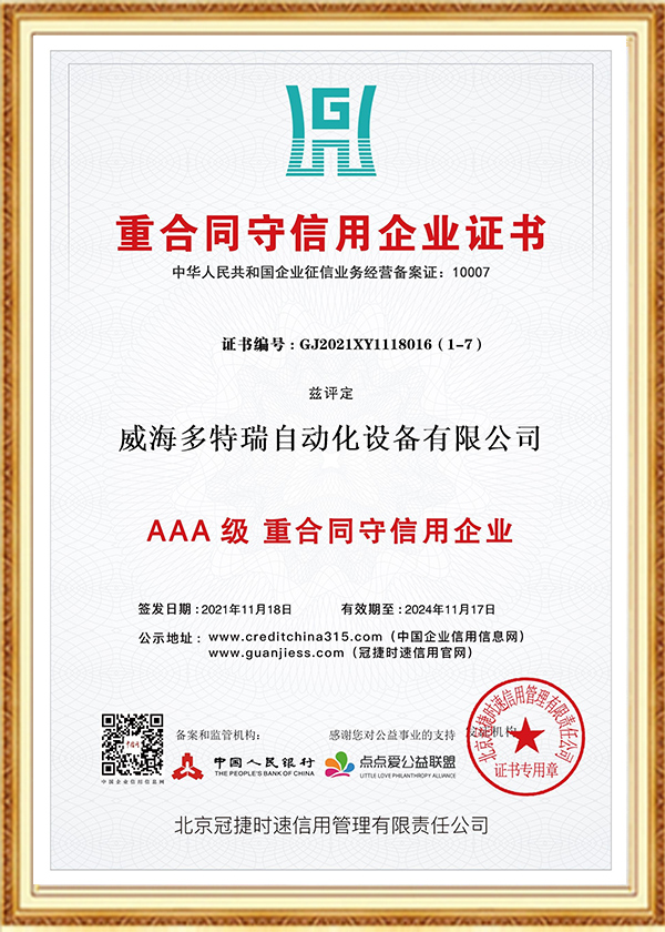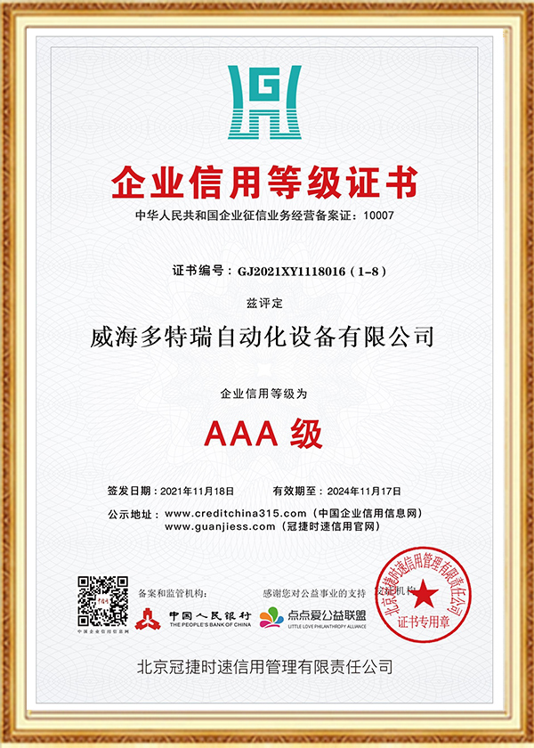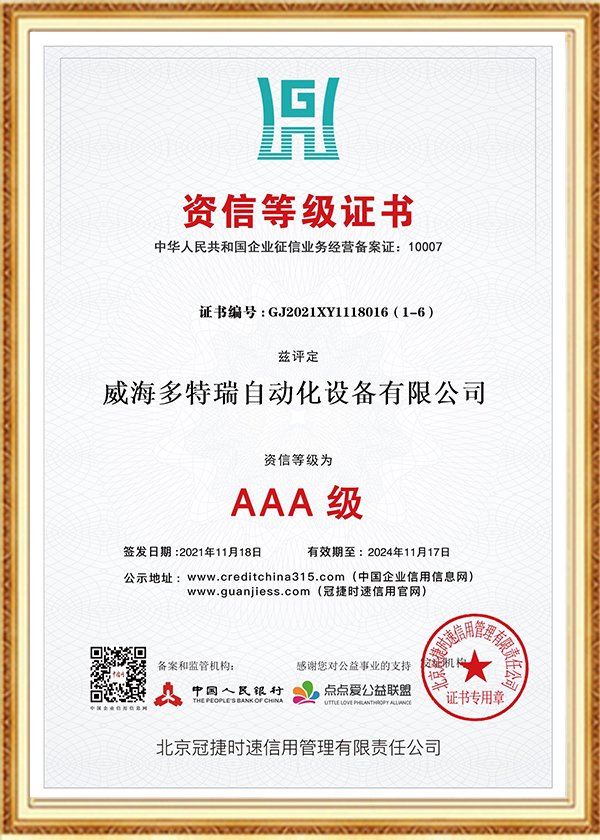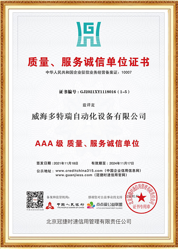 多特瑞自动化设备有限公司创立于2016年,是一家集研发、生产、销售、服务于一体的高新技术企业,企业在发展过程中始终坚持诚信经营理念。以人为本、不断创新是公司发展的动力源泉,至今为止,公司已经取得近几十项专业级认证证书、荣誉证书、标准认证、发明专利证书等。