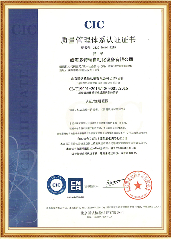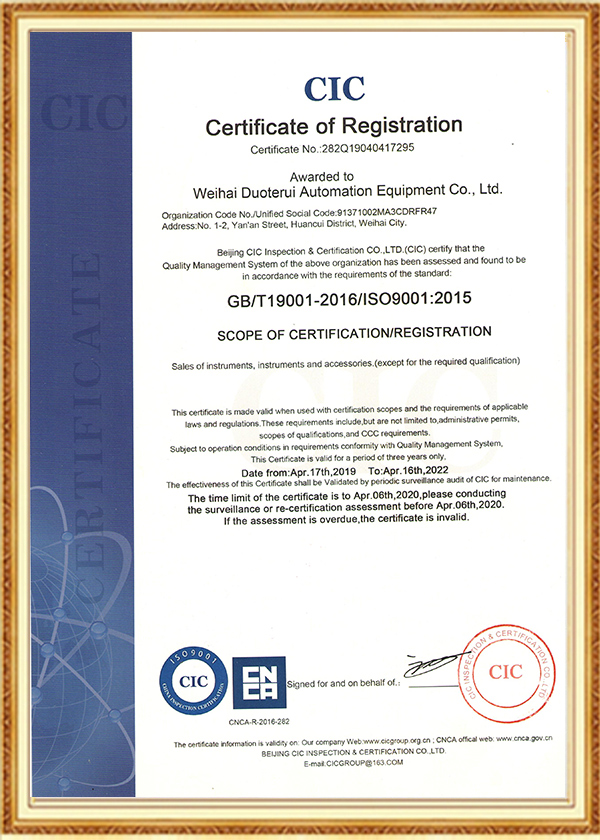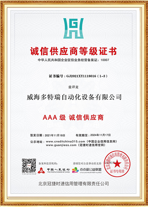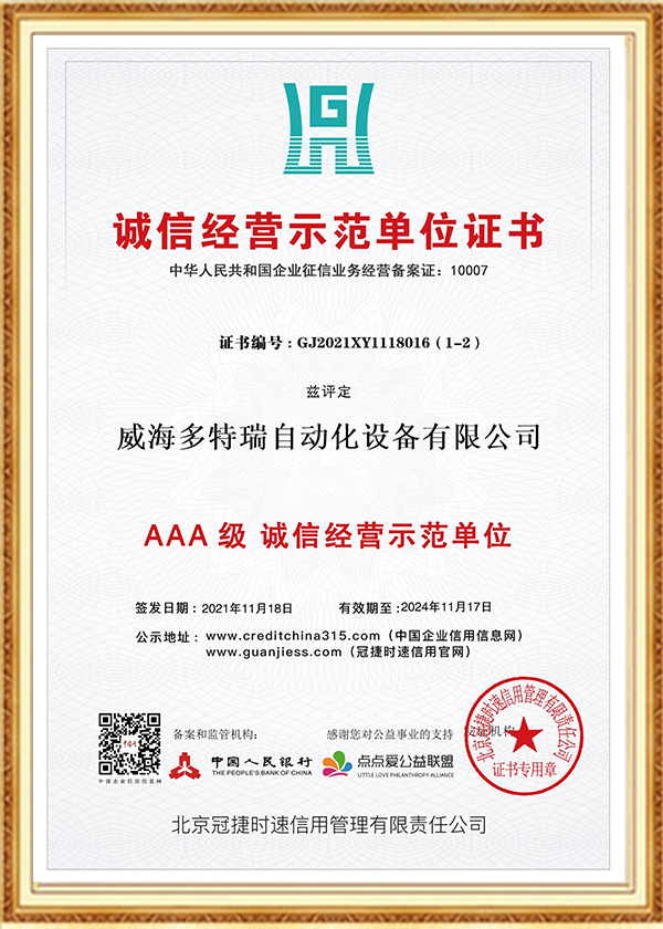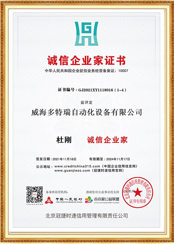 多特瑞自动化设备有限公司创立于2016年,是一家集研发、生产、销售、服务于一体的高新技术企业,企业在发展过程中始终坚持诚信经营理念。以人为本、不断创新是公司发展的动力源泉,至今为止,公司已经取得近几十项专业级认证证书、荣誉证书、标准认证、发明专利证书等。